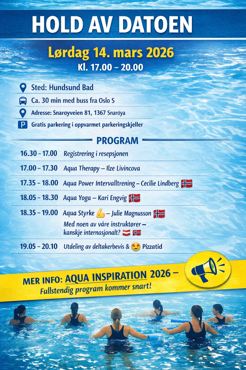 En kveld med faglig pÃ¥fyll, inspirasjon og treningsglede i vann Etter 3 Ã¥r siden sist Aqua Inspiration, kjenner mange av oss behov for nye ideer, ny energi – og ikke minst Ã¥ ha det gøy sammen! Vi har derfor gleden av Ã¥ invitere deg til en inspirerende og aktiv kveld for…